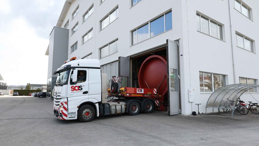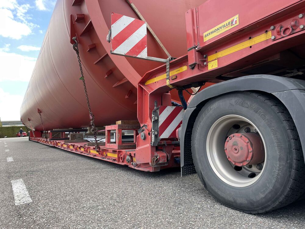 Der imposante Wärmespeicher wurde am Freitag, 27. März 2026 in Oberburg im Kanton Bern auf einen langen Tieflader geladen. In der Nacht auf Samstag erfolgte dann der anspruchsvolle Spezialtransport in den Kanton Aargau und am Folgetag die präzise Aufstellung mit einem grossen Pneukranwagen.